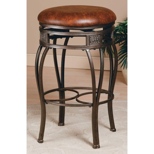 This swivel counter stool has a sturdy tubular metal construction with subtle details. Curved legs and looping detail in a round design soften the look and add elegance. The cushioned, 360 degree swivel seat allows a versatile convenience. Backless counter stools are especially convenient in the kitchen by a counter or breakfast bar. Design by Hillsdale.