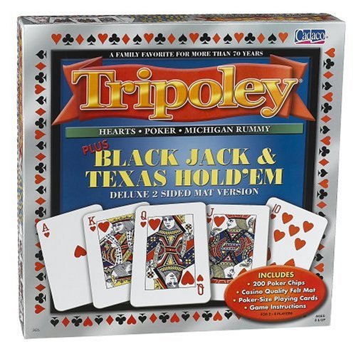 The family favorite of Hearts, Poker and Michigan Rummy is now teaming up with two exciting partners - Texas Hold 'Em and Black Jack. Enjoy the fast-paced game of Tripoley on the casino-quality mat. Flip the mat over and have even more fun playing either Texas Hold 'Em or Black Jack.