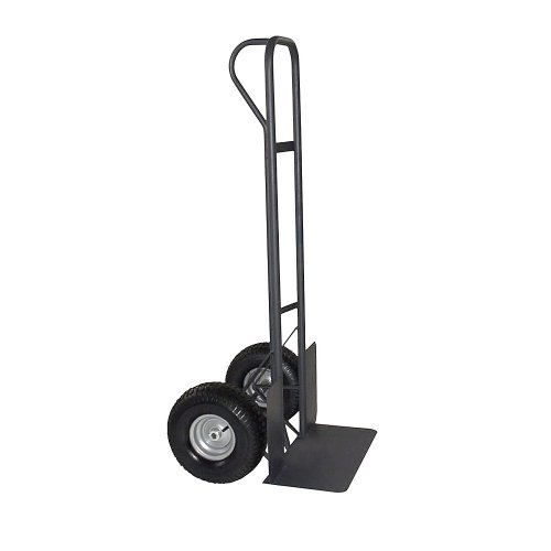 Large 15" pneumatic tires help this MILWAUKEE Hand Truck move loads smoothly over rough terrain indoors or out. P-handle eases maneuverability with one hand. Strong 11/4" tube frame combines with extra-wide noseplate support heavy 1000-lb. loads without compromise. 60"H frame accommodates stacked boxes. Wheel guards protect load.