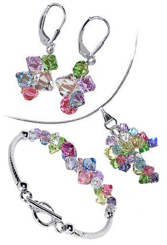 Sterling Silver Multi Color Crystal Earrings Bracelet with 16 inch Necklace Jewelry Set Made with Swarovski Elements Product Description: