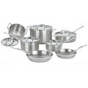 For those of you considering upgrading your cookware to professional grade stainless steel, look no further.I've owned this 12 piece set for over a year, and can't offer enough praise. It still looks brand new (use Barkeepers Friend to clean it). It heats evenly and quickly, retains heat for a long time, sears and browns well without burning, handles comfortably, cleans up easily and looks great! I'm fortunate enough to have several different types of cookware to compare. My cookware includes: All-Clad, JC Penny Elite (5 ply Copper Core), Chefmate tri-ply, Hard Anodized non-stick and Cuisinart Tri-Ply Copper.In my opinion, the All-Clad Stainless Steel line is much overated. Its great cookware, but has no rolled edges for easy pouring without making a mess, and I prefer the handles on just about any other brand. All-Clad's materials and construction are the same as the other premium lines, with the exception of the rolled edges. Incidentally, staunch supporters of All-Clad make inferences of inferiority when speaking of other brands such as Cuisinart, stating "its made in China". I have two All-Clad pans hanging on the pot rack right now, one made in China, and the other made in Indonesia. Most of their line is made in the USA, but premium cookware made overseas (including some of their own lines)is not inferior!The Chefmate Tri-Ply in direct comparison to the Cuisinart cooks and handles about the same with a slight edge in cleaning ease. The Chefmate has a true mirror finished interior, but overall isn't as heavy duty. The Stainless Steel lids are also a lighter gauge. Its been discontinued.The JC Penny Cooks Elite 5 ply Copper Core is fantastic cookware, and the equal of the All-Clad Copper Core in every way except the handle. The handle of the Elite is far superior to All-Clad's. In comparison to the Cuisinart, its very comparable in performance, but quite a bit heavier. Its original price was about 2-3 times the cost of the Cuisinart. It too has been discontinued.The Hard Anodized non-stick cookware is fine, convenient to use, even heating, and now relegated to camping. It doesn't brown foods like Stainless Steel does. The non-stick fininsh WILL wear off, and render the cookware somewhat useless with daily use.The Cuisinart Copper Tri-Ply is fantastic and really the only competitor for the Multiclad. It looks fantastic, cooks fantastic and gives you an ever so tiny advantage in temperature control over the Multiclad. The pots and pans are the same configuration as the Multiclad, albeit with an outer layer of Copper instead of Stainless Steel. The handles are different as well, but both styles of handles are cool to the touch and comfortable to hold. I enjoy the Copper and don't mind the few minutes it takes to polish, but if you don't want Copper and the extra effort, the Stainless is perfect. I only use the Copper when preparing special dishes for company or when I need specialty pans such as Sauciers for Risoto or sauces. Otherwise, I rely on the Multiclad for daily use.Incidentally, I have no afilliation with any of the above cookware brands. I am in the food service industry (restaurant design and build) and have the opportunity to speak with many chefs. You'd be very surprised by how many of them use Cuisinart Multiclad or Copper tri-ply at home. I'd say its a 50-50 split between All-Clad and Cuisinart for their home use.With so many high end brands after your hard earned dollar, you can buy similar quality and performance, but there is no better value than Cuisinart Multiclad. It's heirloom quality and will be your last cookware purchase.Update:I reviewed this cookware set some time ago, and thought it appropriate to write an update. I've been reading through all the reviews that have been written since my first review, and everyone seems to say "as good as All-Clad".I DISAGREE!Cuisinart Multi Clad isn't as good as All Clad; IT'S BETTER! I have both All Clad and Cuisinart as well as other brands of high end cookware including Tri Ply, Five Ply Copper Core, Copper etc. Here are my reasons for declaring Cuisinart the winner:o Rolled edges on the Cuisinart eliminate dribbling down the side of the pan as experienced with the All Clad. All Clad top of the line Copper Core does have rolled edges as well, but their stainless line that directly competes with the Cuisinart does not. In daily use this makes a huge difference.o The Cuisinart handles are far superior to the All Clad. The Cuisinart remain cool enough to touch without pot holders, and their ergonomic shape and angle are very comfortable when shaking, flipping, tossing and moving the pans. The All Clad handle is thrust up at a sharp angle which is somewhat awkward, and the handle itself is uncomfortable.0 The Cuisinart can be used on induction ranges. The previous Multi Clad line wasn't designed for induction ranges, but the Multi Clad Pro is and therefore no more advantage to All Clad in this respect.0 The Cuisinart line cleans up easier than All Clad. I've cooked eggs in both All Clad and Cuisinart pans using the same prep and cooking mediums. In fact, I've cooked one egg per pan using the same burner without altering the gas flow. Eggs stuck slightly in the All Clad, and not at all in the Cuisinart. The Cuisinart's interior is slightly more highly polished than All Clad, and I suspect this to be the reason. I was able to repeat the same results with skin-on chicken, fish and other troublesome foods. Deglazing and clean up is just easier with the Cuisinart.o Some All Clad pieces don't come with lids! You have to purchase a lid as an option. I have nearly every piece of Cuisinart, and each came with a lid (skillets are the exception).o Cost. Cost isn't the only factor here. However, if two products perform similarly and will last virtually forever, why pay way more for one based on brand prejudice? The product that performs the best should be the clear winner regardless of price. Therefore, Cuisinart wins outright, and the fa