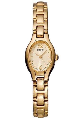 This Seiko gold-tone women's timepiece has an oval, gold-tone dial with the Seiko logo located below 12:00. With gold-tone Arabic numerals located at 12 and 6:00, it has gold-tone hour markers at all remaining positions. There are gold-tone hour, minute and seconds hands. Bracelet: Gold-tone metal Movement: Seiko Quartz Crystal: Hardlex Crown: Push/Pull Clasp: Jewelers Bracelet Measurements: 7-1/2"L x 8.5mm W Case Measurements: 18mm W Water Resistance: 3atm - 30m - 100ft Model Number: SXGJ72 Warranty: Three year limited warranty provided by Seiko Corporation of America Additional Features: Watch comes packaged in a Seiko watch box with instruction manual and warranty information. ShopNBC is an authorized dealer of Seiko watches. California residents only: "Proposition 65" WARNING