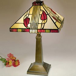 Sculpted antique bronze finish metal creates the base of this small Dale Tiffany accent lamp. The square chimney shade features designs in colorful hand-rolled art glass, inspired by Mission style stained glass. With 240 cuts of glass, this lamp will be a treasured highlight of your home decor for generations.