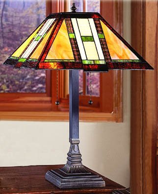 The Arrow Base Mission Table Lamp is an elegant addition to a variety of decors. Each Paul Sahlin Tiffany stained glass creation is carefully cut, hand foiled and then soldered together by talented craftsmen. Because each piece is made by hand from art glass, it is unique in color and style. It may have some blisters, seeds, lines, and variations in the surface. These are not defects, but are simply characteristic of hand crafted fixtures and stained glass. Resin lamp base comes in a hand-polished antique pewter finish. All fixtures are U.L. approved. The unique designs and exceptional quality of these stained glass creations makes them a welcome addition to any home. .