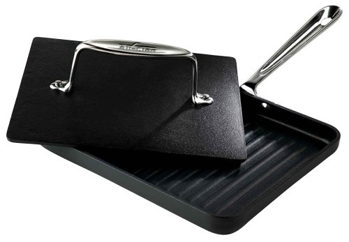 I have nothing but praise for this pan. I have been using it 4-5 times per week since I purchased it.The pan heats quickly and evenly and gives that perfect grilled crust to everything I have tried. It did take some practice to get the temperature and timing down - I heat the press on another burner at 9/10 and the pan at about a 4/10. That gives me the perfect browning to both sides while also allowing enough time for the sandwich to get hot throughout. All Clad gives some advice on timing and procedure, but I think my system works better. Be aware, the handle of the pan stays cool but the press handle can get hot.The listing does not say, but the press is cast iron and quite heavy. Cleanup of the press and pan is easy. The non-stick of the pan works well and the cast iron cleans up easily (I always butter or oil what I am grilling, so ymmv).I now get perfect sandwiches every time, and never have to worry about all the things that can go wrong with an electric panini press. I am sure this pan will give me many years of great service.