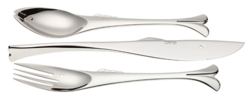 Yamazaki Gone Fishin' stainless flatware contains four sets of five pieces, and a matching Entertainment Set at no additional cost. Each placesetting includes 1 dinner knife, 1 soup spoon, 1 dinner fork, 1 salad fork and 1 teaspoon. The Entertainment Set includes 1 large serve spoon, 1 large serve fork and 1 pastry server.